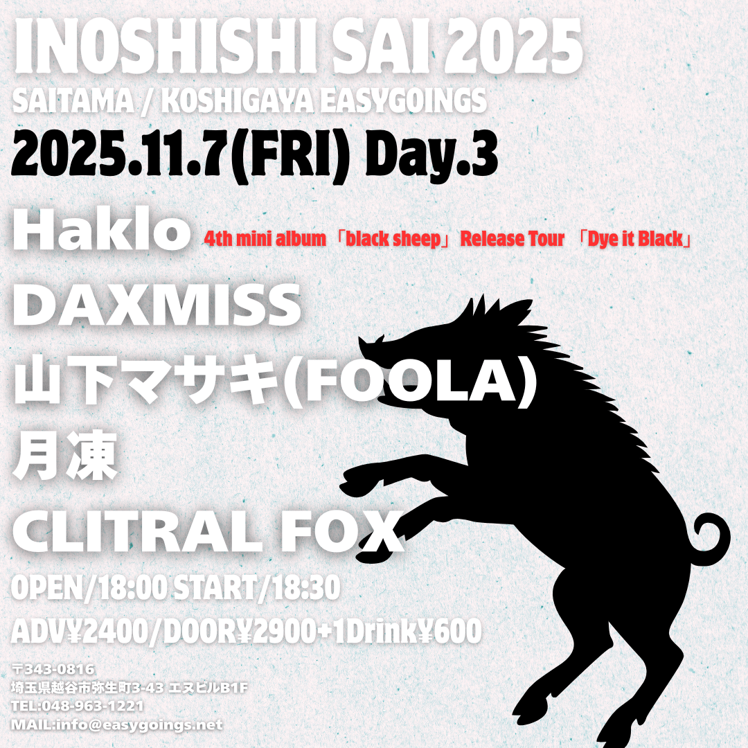 11/7(金)越谷EASYGOINGS INOSHISHI SAI 2025 DAY.3 Haklo Rellease Tour「Dye it Black」