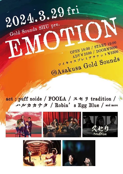 3/29(金)浅草Gold SoundsGold Sounds SHU pre.”EMOTION” w / puff noide / スセリtradition / ハルカカナタ / Robin&#
